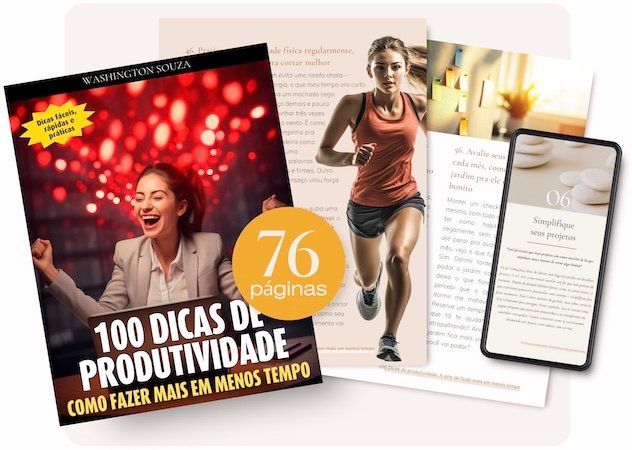 É um ebook com 100 passos práticos pra você organizar sua vida, dominar seu tempo e alcançar mais sem se esgotar. Não é teoria complicada – são dicas simples, testadas por mim, pra transformar seu dia em algo leve e cheio de conquistas. Pense num guia amigo que te pega pela mão e mostra o caminho.